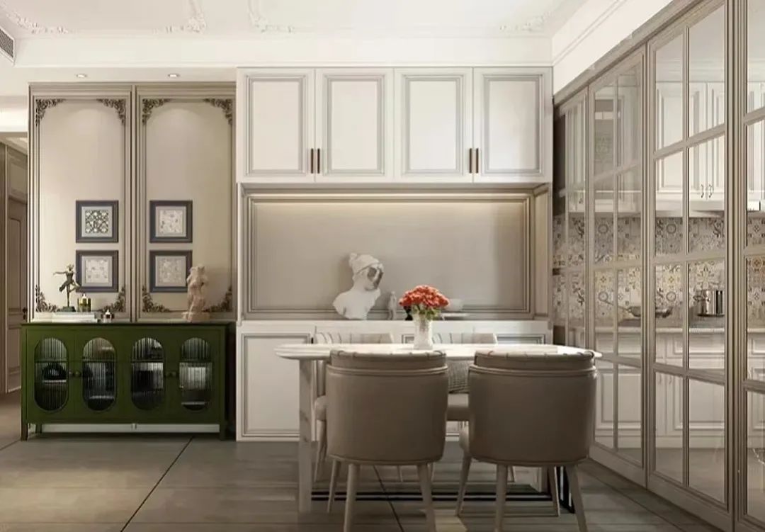 奶油色餐桌餐椅搭配白色餐边柜,打造温馨浪漫的用餐环境