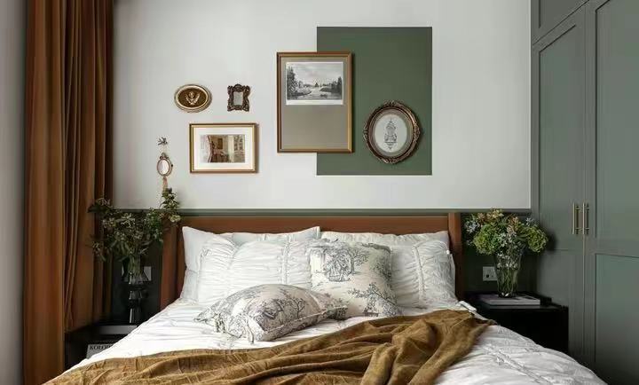主卧利用石膏线做了背景墙分层,底部刷了复古橄榄绿,上层刷的浅灰色,让空间更具层次感。衣柜也延续了橄榄绿,同步在背景墙上层,加入了橄榄绿色块,形成色彩呼应,让整体效果更和谐。软装搭配上也比较讲究,白色褶皱丝质床品,搭配宫廷风抱枕,让空间多了几分优雅与复古。