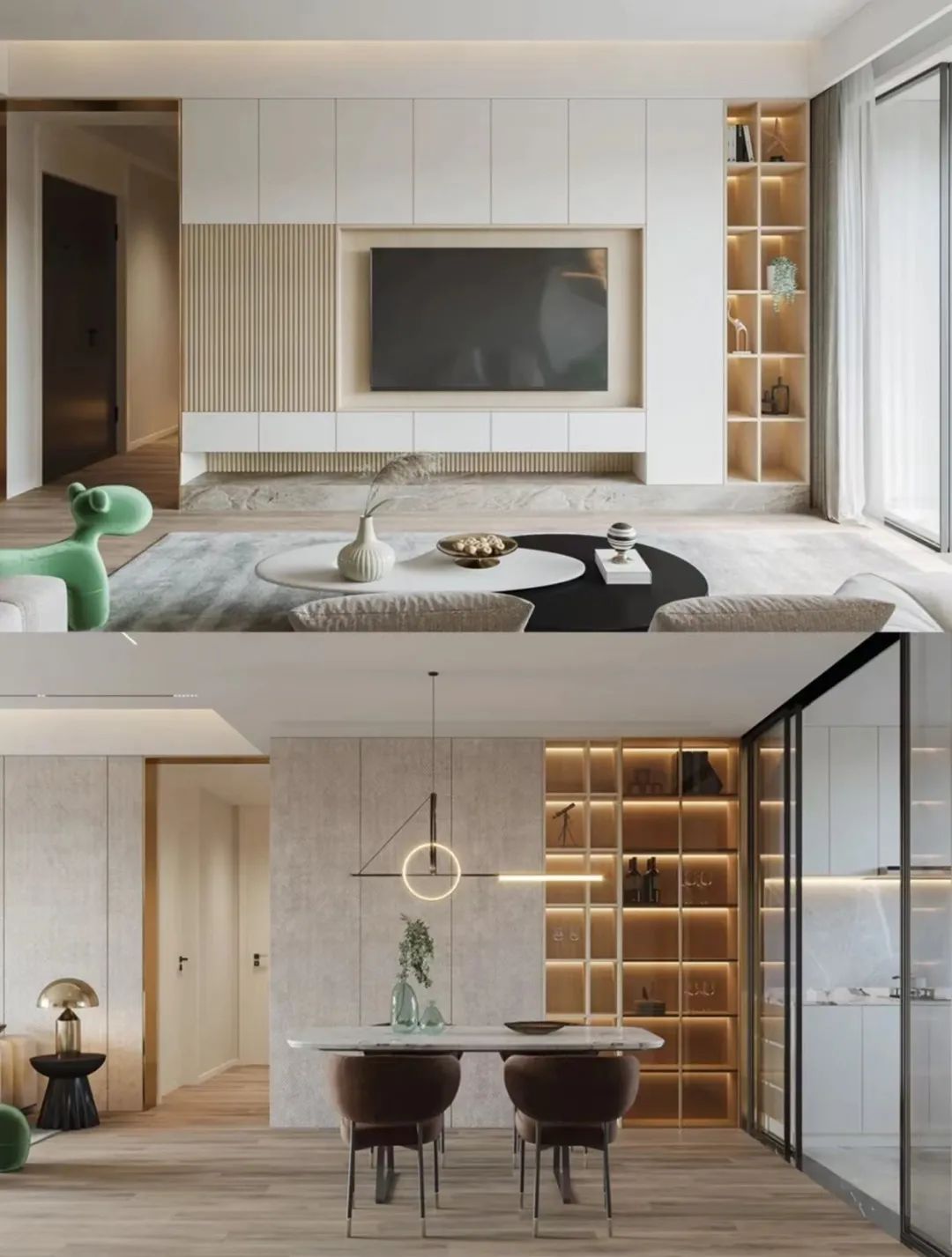 电视背景墙一侧定制展示柜,每一件艺术收藏都自成一道风景,沙发背景墙选用素雅的灰色壁布和大理石岩板拼接设计,简约清新而雅致。