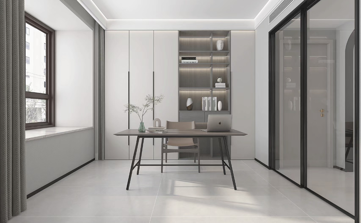 在业主的使用定义当中,书房应当是纯粹的,墙边定制顶天立地书柜,搭配简约风书桌椅,打造舒适的学习工作空间