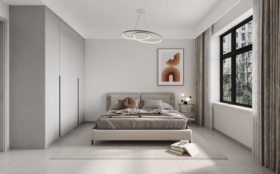 主卧没有采用过多复杂的装饰造型,简约吊灯营造出柔和的光感,以白色为主色调沉静优雅,为放松和睡眠提供更加舒适的氛围环境