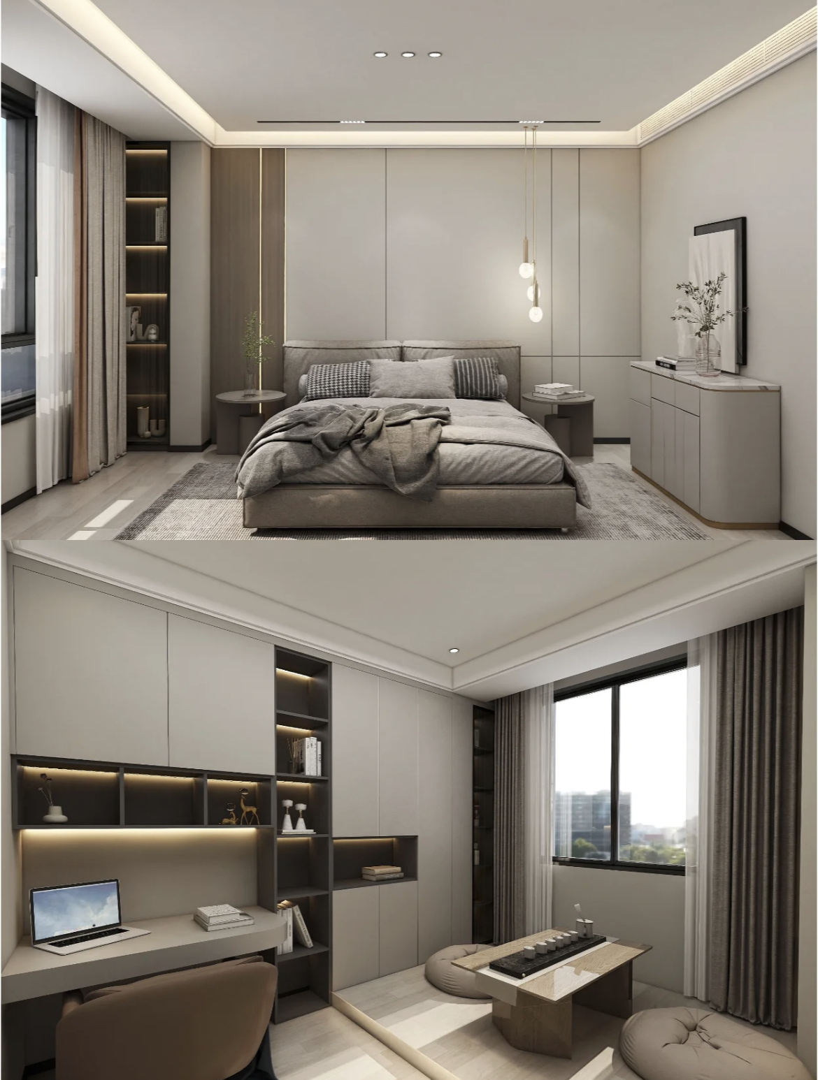 以米白色和灰色为主色调,简约大方,明亮清新,自然舒适。