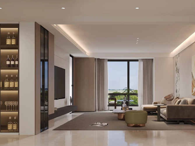客厅整体以浅色调为主搭配木质墙板和大理石纹理相碰撞,颜色,肌理的反差提升了整体空间艺术感,将艺术与生活相结合。