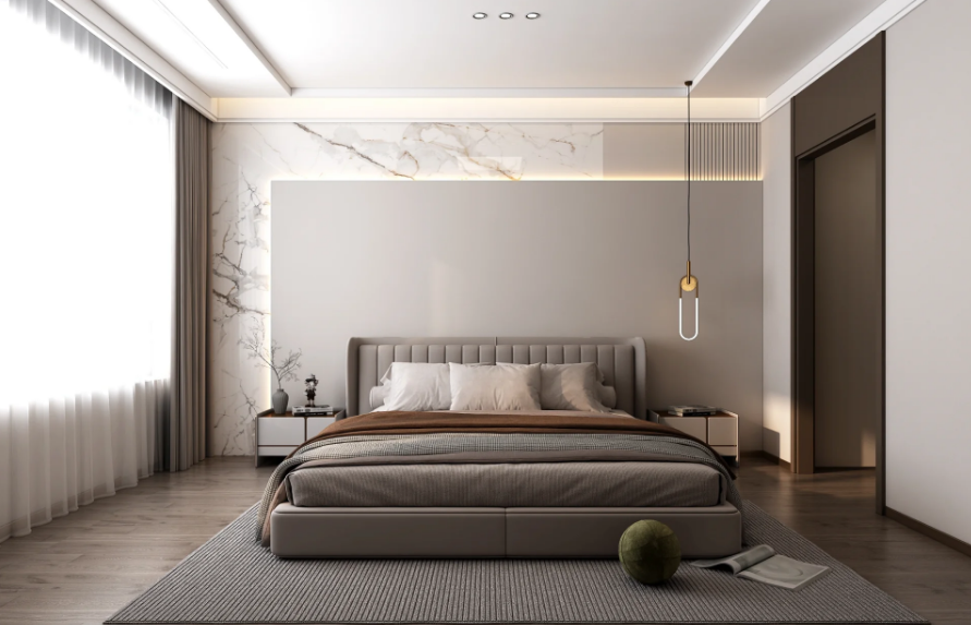 化繁为简的设计理念,木质地板与床上绿色相点缀,以大理石底纹做背景墙,使整个空间充满意境。