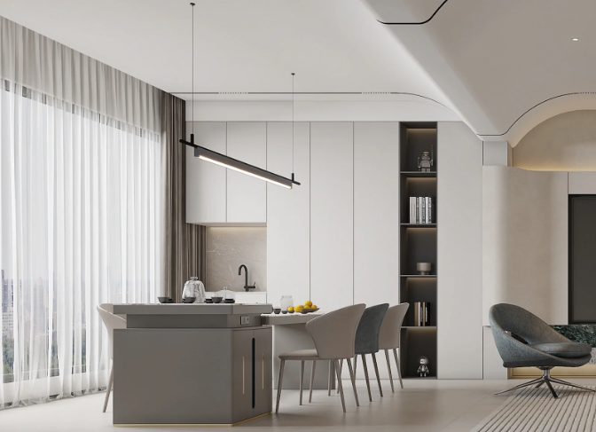 餐桌椅整体用浅色系来搭配,和客厅整体的颜色相融合不会显得不协调,旁边再加上岛台的设计,也使整体的用餐更加方便快捷。