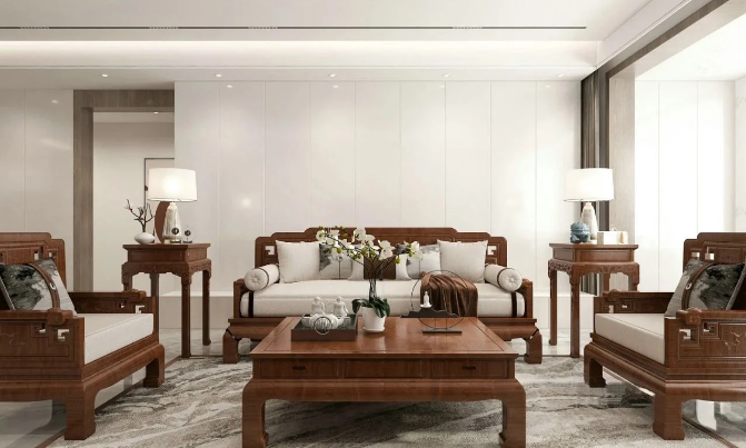 一切以简约为主却又不失中式雅韵内涵,中式的家具+简单的造型点缀出中式的味道,深色的沙发、茶几、电视柜搭配浅色的墙面,整体空间是那么的和谐。