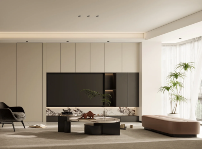 电视背景墙整体颜色以浅咖色为主,电视做内嵌式设计,在增加收纳空间的同时增强了空间层次感材质,隐形门采用与柜体相同材质衔接处理使整体空间更加通透明朗。