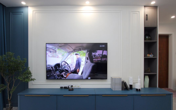 电视背景墙与沙发背景墙一样,用石膏线勾勒框架,线条流畅层次分明,空间氛围素雅而精致。灰色的地砖全屋通铺,搭配背景墙与家具,整个家里清新明亮回到家就会感到特别放松。