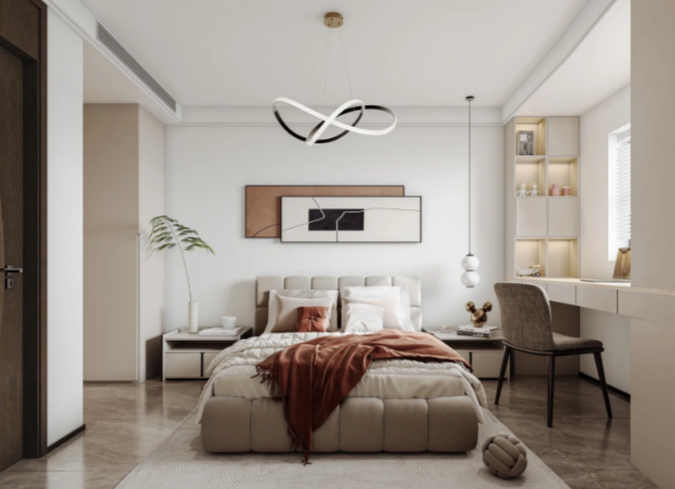 书桌、书柜及收纳一体的靠窗户的设计,开放格可以放置一些小摆件或是书籍增加小趣味性,墙面上的装饰画和旁边垂落的小吊灯让空间更具灵魂,同时让墙面不会显得空荡。