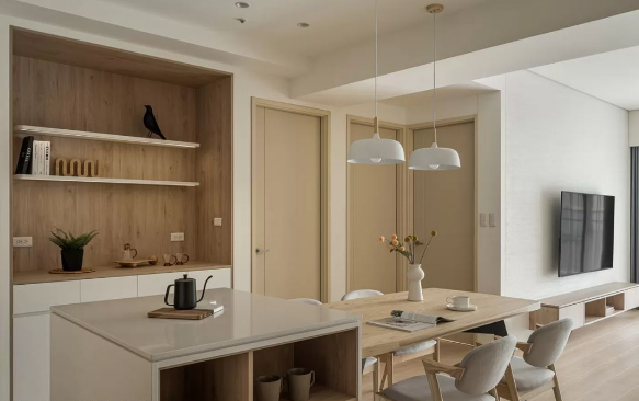 设计的岛台连接餐桌,平时还可以泡茶喝咖啡。餐桌采用的是原木质,跟整个空间风格融为一体,搭配两盏温暖的吊灯,让用餐都很有仪式感。
