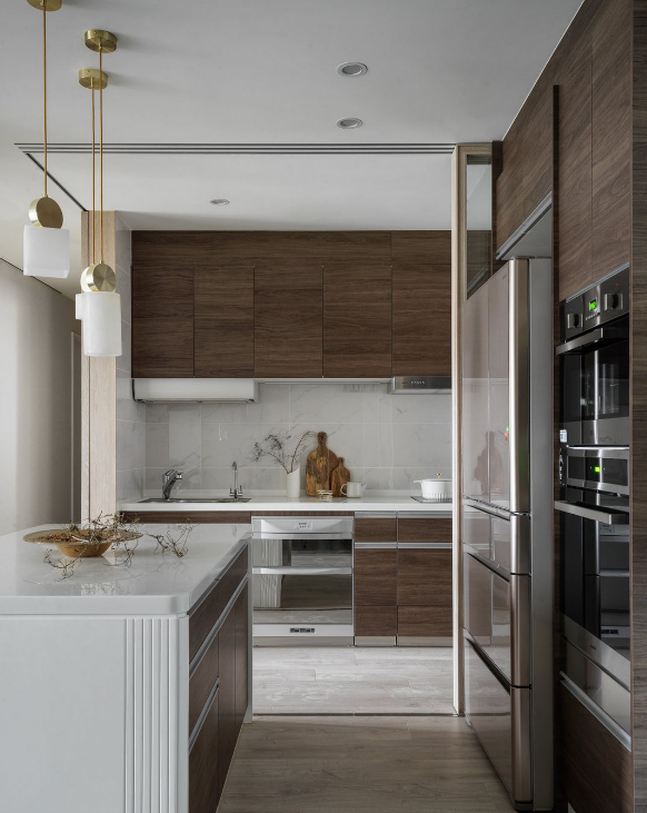 餐厅一边做满柜子保障家的收纳功能,餐边柜采用上中下加边柜分功能分区设计,将家电嵌入餐边柜增加空间的利用率同时保障家的齐整性。西式中岛台作为餐桌,将客厅与厨房进行一个功能性分区,玻璃移门作为隔断,使空间视觉采光都得到改善。