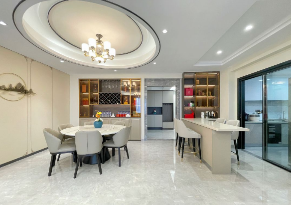 壁画上山水意境在射灯的加持下彷如一幅艺术作品陈列于此,共筑整体的清雅闲适。穹顶搭配复古金属灯饰,丰富空间层次感,光线晕染之处聚焦视线于餐品的色相,聚焦生活的细节。L形中岛设计丰富空间动线,会客、闲谈、休憩需求均能一一满足,多空间展示壁橱精美陈列,丰富家装空间。