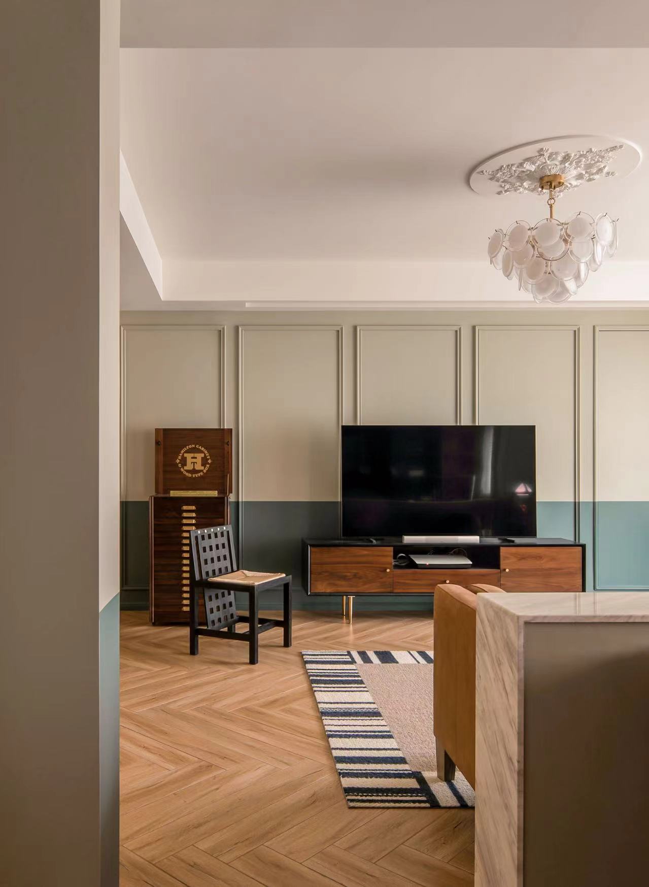 客厅与与阳台打通后,以一组拱形门营造家居的精致仪式感。选择百叶帘搭配纱帘,可根据阳光调节室内的光影;电视背景墙选择深浅不同的复古绿丰盈墙面的层次感;