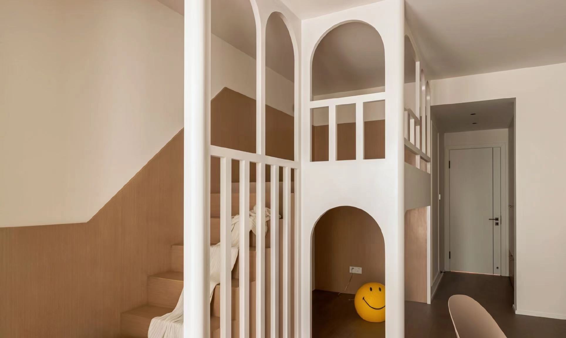 专门为小朋友定制上下床,下方空间可以作为小朋友的玩耍会客区,阳台位置增加了一组地台,方便日常练习乐器。