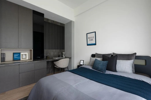 引入深蓝板材为基底,以多线条变化为主题,从衣柜渐变至书桌,即现质地微妙幻化,再由淡柔大地色,形塑为大型高柜,藉以轻重色系,达到一室平衡。