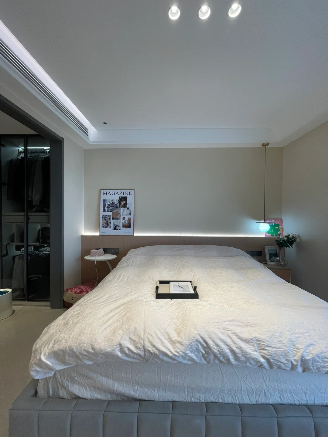 原木色木纹半墙护墙板加内嵌灯带,比较有层次和氛围感,这样让大白墙不会很空,高级感满满。