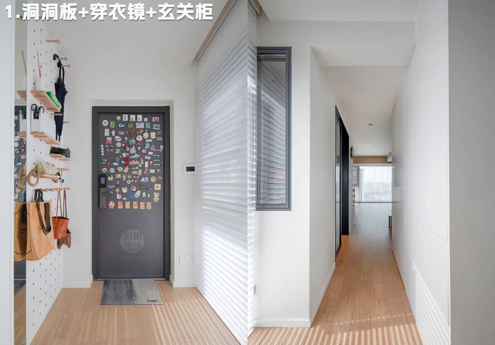 ◾入户右侧安排一整面洞洞板,挂钩搭配置物架,随身物品一挂一放,顺手又方便,内嵌穿衣镜,方便着装打扮,同时还能放大空间。