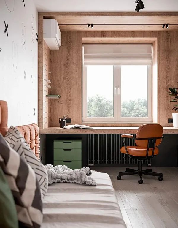 一般小孩子都是比较喜欢亮的颜色 所以儿童房没有大面积的使用黑白色三个颜色,而是选择了充满活力的橙色,可以让整个房间变得明亮有活力。