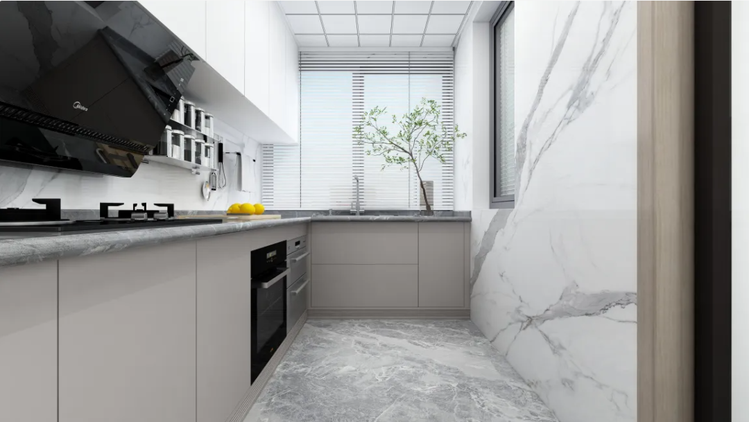L型厨房的设计充分的利用厨房中间空旷的地区,让用户在洗、切、炒这个过程内形成一个三角型的活动曲线,非常的方便实用。