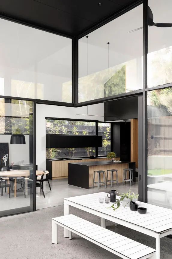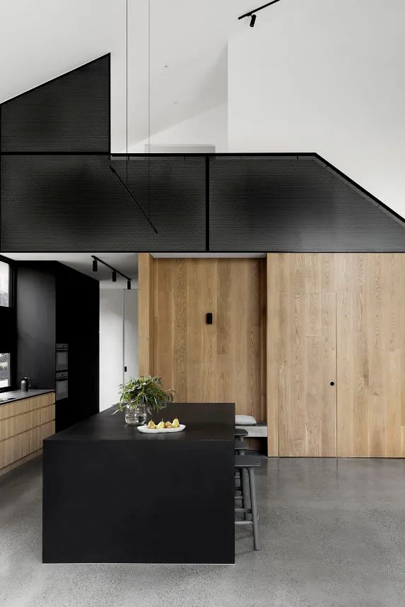 在这个空间里面利用了浅灰色的水泥地板过渡,黑色的岛台搭配原木的设计看起来高级又有质感,让整个屋子的色彩更具平衡感。