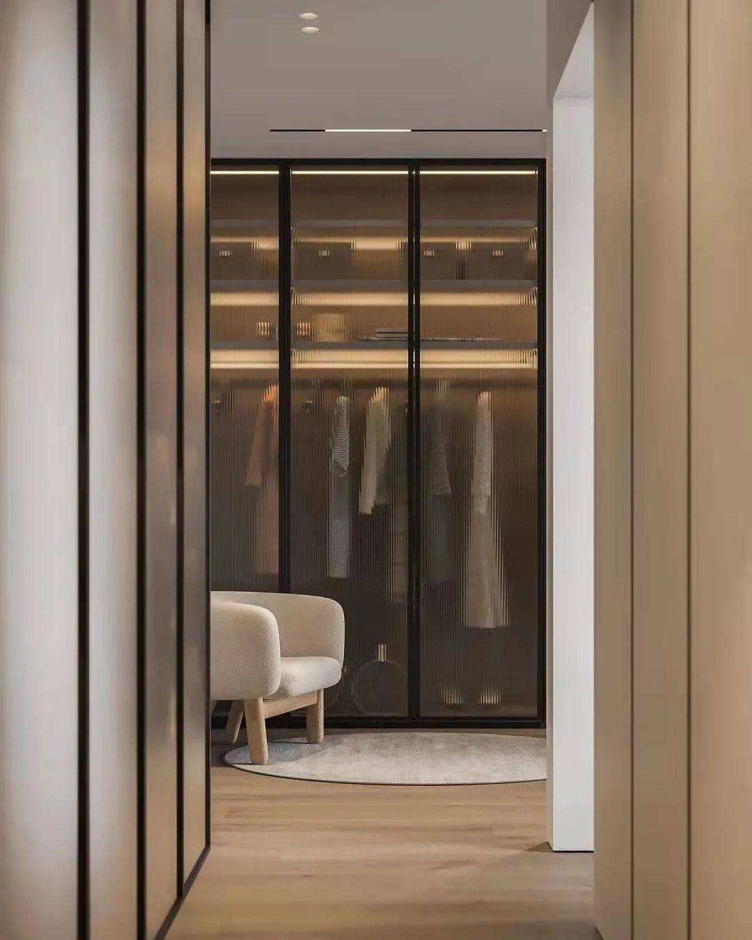 衣帽间在卧室的旁边,透明的衣柜提供了良好的视野,旁边还有书桌,方便日常的办公。